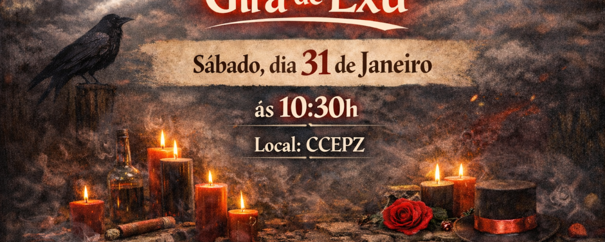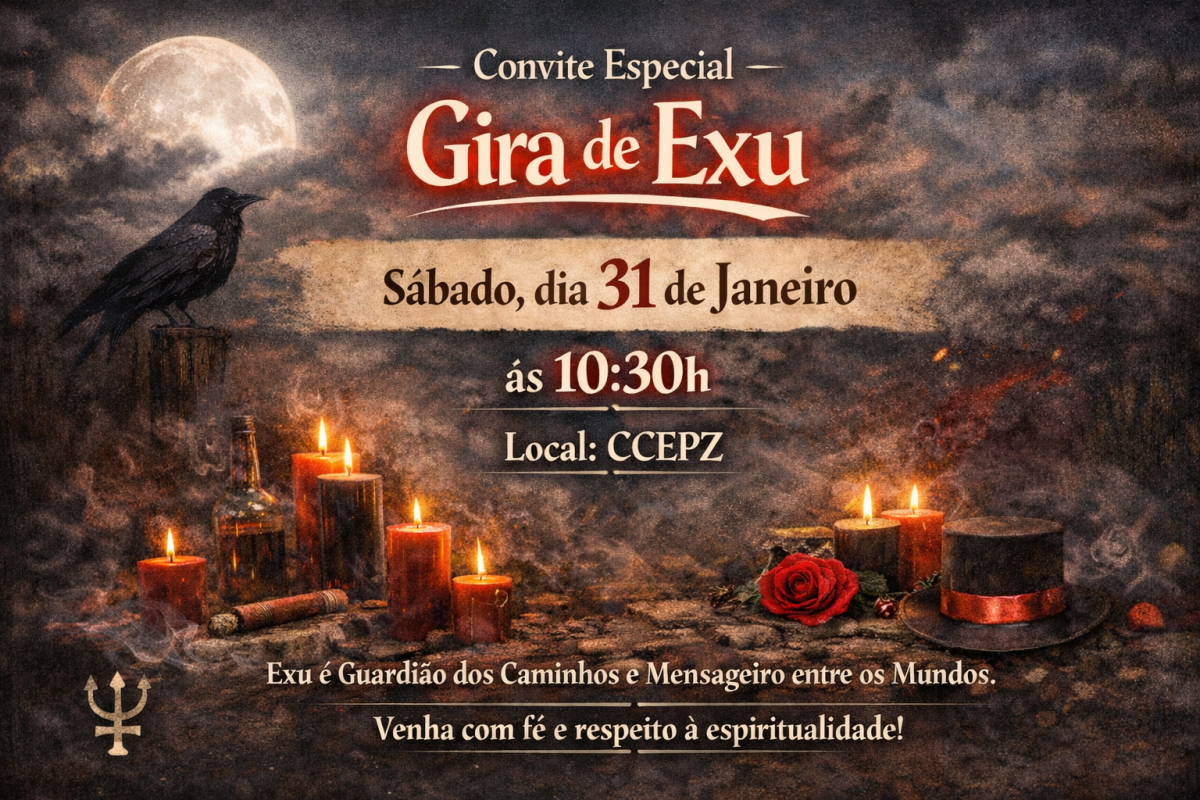 05/02/2026O CCEPZ convida com respeito e responsabilidade espiritual a todos os irmãos, irmãs e visitantes para a Gira de Exu, momento de firmeza, esclarecimento e abertura de caminhos.